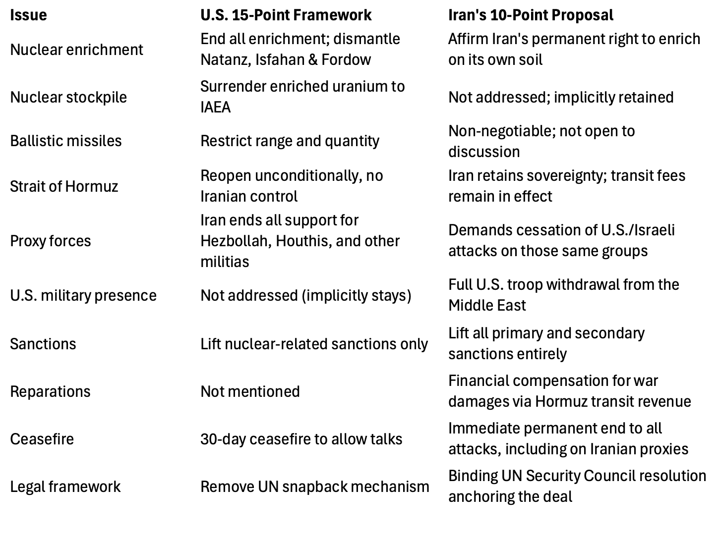 The U.S. went to war for objectives that were not clear and only defined post hoc. That’s already a huge problem. Eventually, the U.S. articulated a 15-point agenda of things to which it wanted Iran to agree. Iran, meanwhile, had its own 10-point list. These two lists are largely irreconcilable. The only conceivable way Iran would accede to President Trump’s demands was if the United States compelled it to…which means using force up until the point at which Iran concludes there is nothing more it could do. The only way the U.S. might accede to Iran’s demands was if Washington concludes it has no more moves to make. No more Liberty of Action.